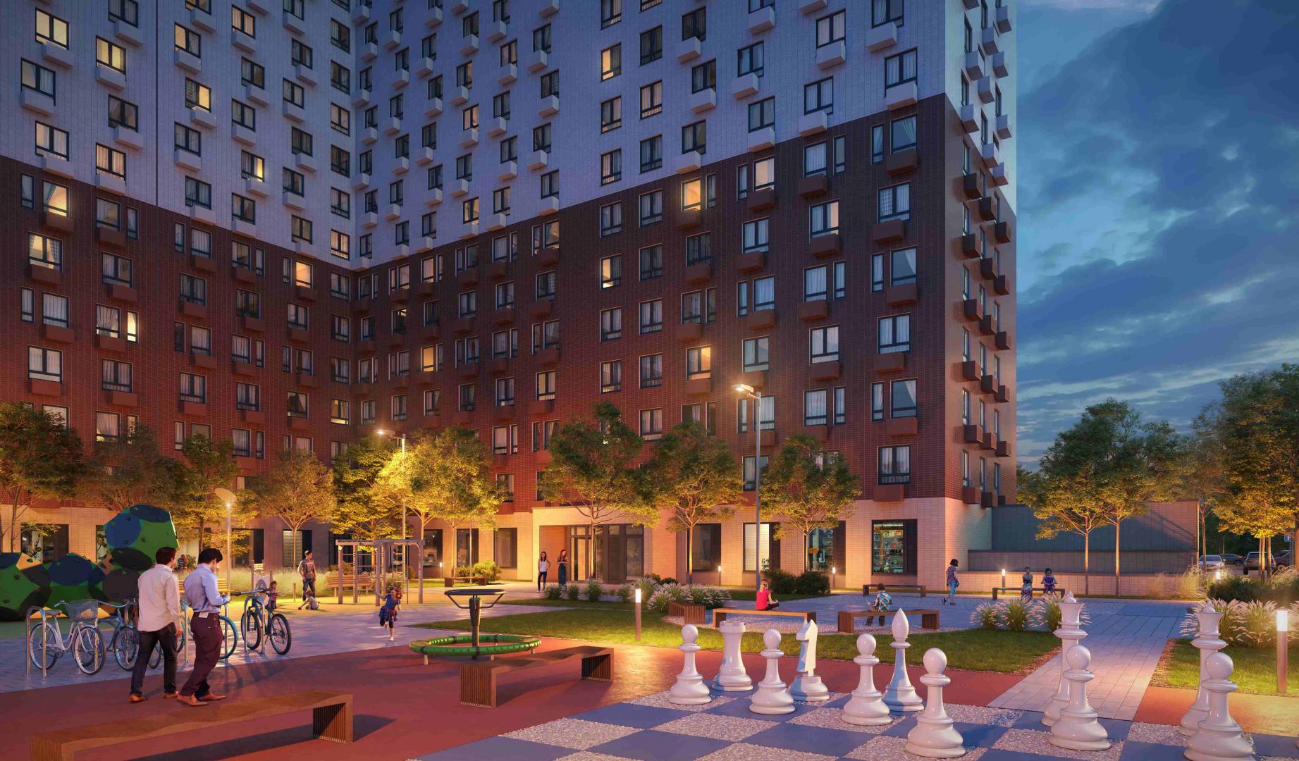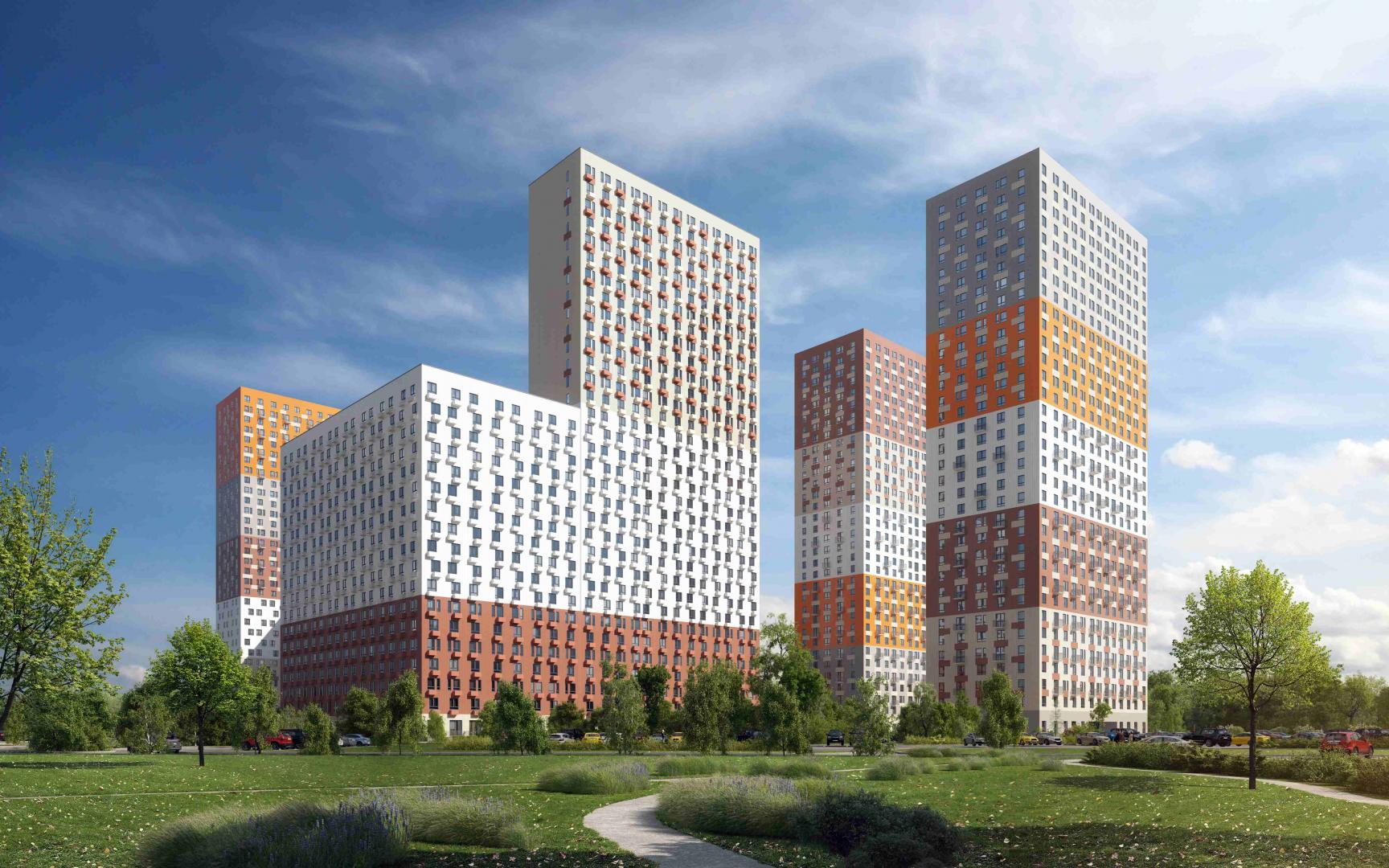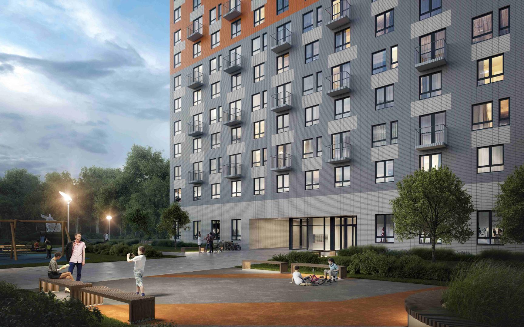 Жилой комплекс возводят по принципу квартальной застройки, которая максимально комфортна для жителей. Т.е дома, высотой от 18 до 33 этажей, расположены таким образом, что образуют внутри себя закрытые безопасные дворы. Каждый двор внутри комплекса озеленён, оборудован детскими спортивными или игровыми площадками. Фасады зданий облицуют навесными панелями пяти различных оттенков. Чтобы избежать нарушения внешнего облика фасадов застройщиком запланированы специальные декоративные корзины для установки кондиционеров. Входы в подъезды расположены на уровне земли без ступеней, для дополнительного удобства мам с колясками и пожилых людей. Светлые холлы со стеклянной дверью, высокими потолками и отделкой стен в светлых тонах. Установлены современные лифты, которые также помогут спуститься на подземный этаж, где расположились парковочные места и индивидуальные кладовые комнаты с высокими потолками для удобного расположения стеллажных систем.