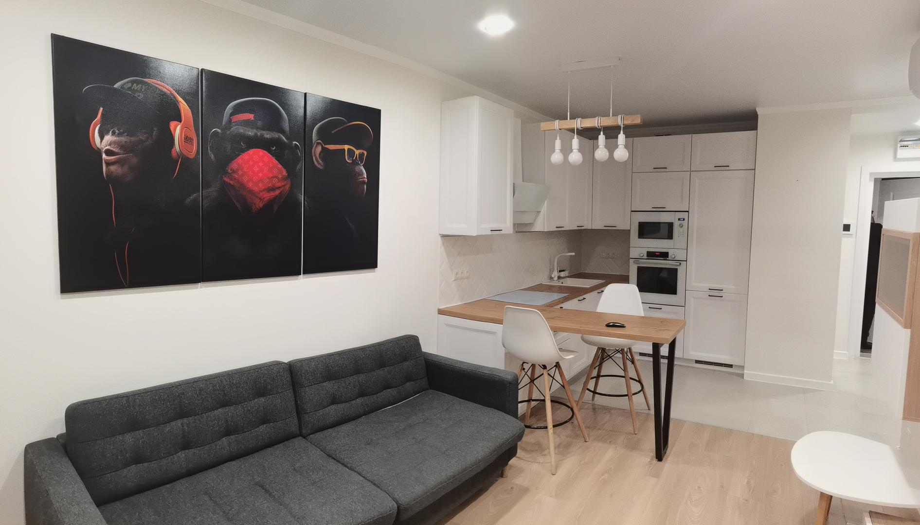 Просторная кухня-гостиная с кондиционером, выполненная в современном стиле. полностью оборудованная техникой в том числе и посудомоечной машиной. Есть фильтр для питьевой воды,